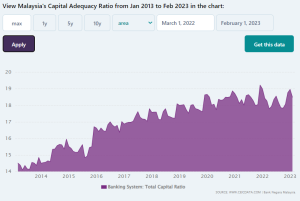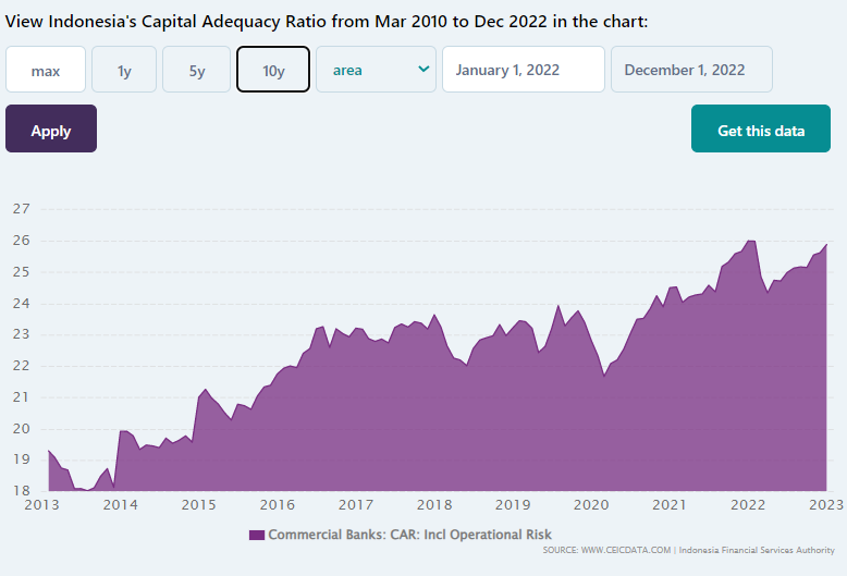 Grafik di atas menunjukkan bahwa rasio kecukupan modal (CAR) perbankan Indonesia naik terus-menerus sejak 2014 dan hanya pernah anjlok di kuartal 2-3 tahun 2020 ketika pandemi Covid-19 baru mulai. Per akhir 2022, CAR perbankan Indonesia mencapai 25,67% (SPI 2022), atau hampir 2x CAR minimum sebesar 12,9% menurut Perjanjian atau Kerangka Kerja Basel III ((https://www.bis.org/basel_framwork/).